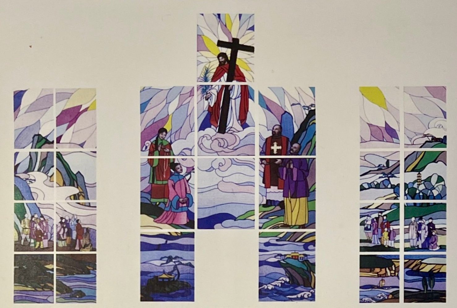 聖堂彩色玻璃窗:祭台後五扇玻璃窗說明:殉道地區川貴、山西及河北的山水為背景;殉道者的服裝以清代式樣,人物是代表性。