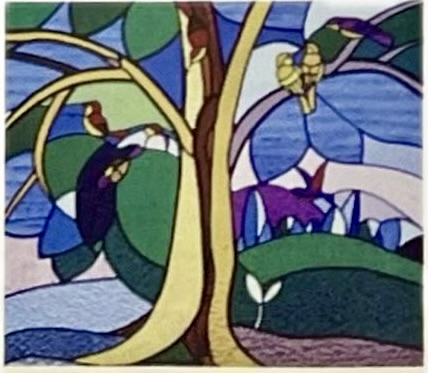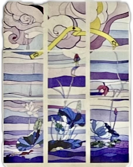 另外原稿中一些较大块的图型在制成玻璃后或会出现压力过大的问题,所以必须稍作修改,揉合西画的画法才可完成。整个图案大约修改了百分之二,而主要是线条的改动,整体构图仍然忠于原著。
