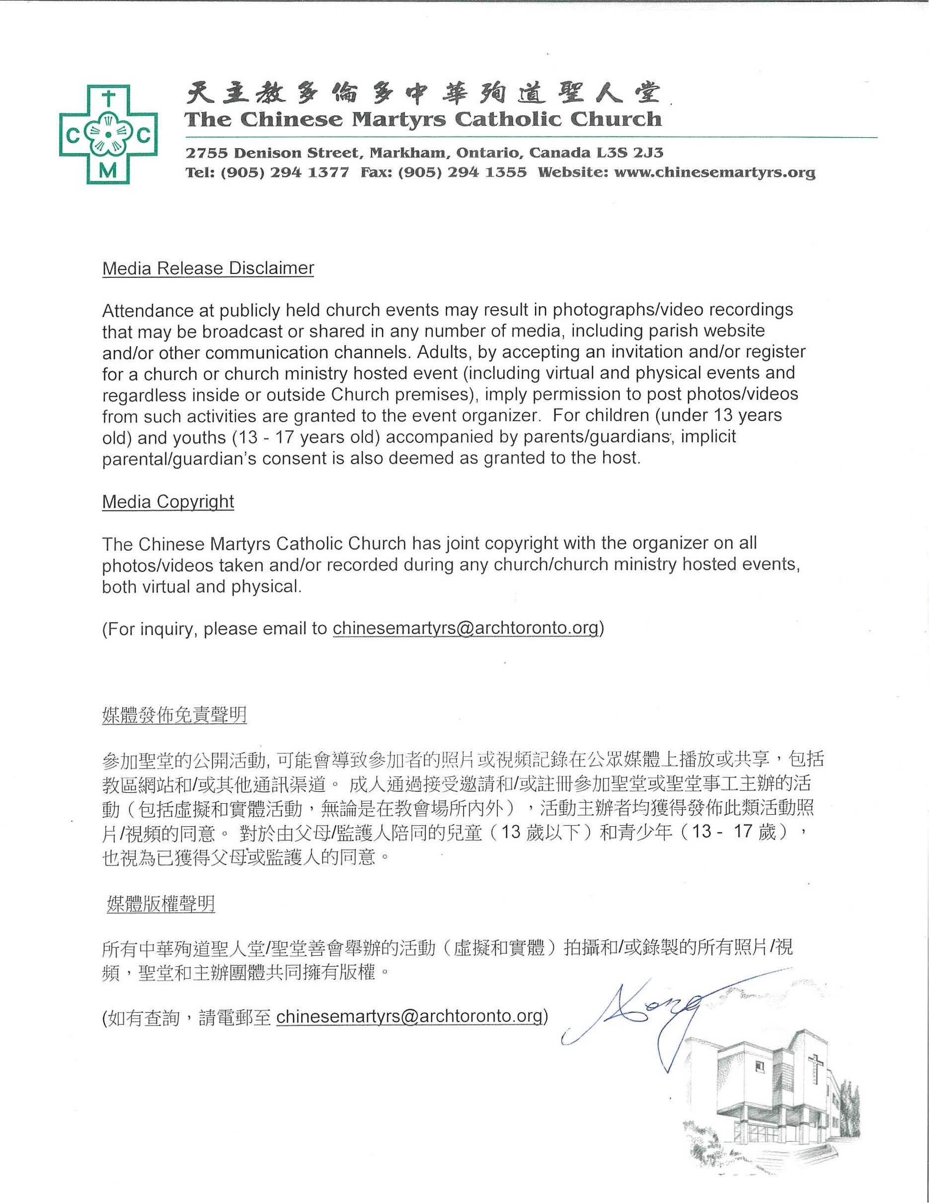 Along with the Social Media Policy issued by the Archdiocese of Toronto, Fr. Deng provides further explanations on the media/copyright policy for our parish.