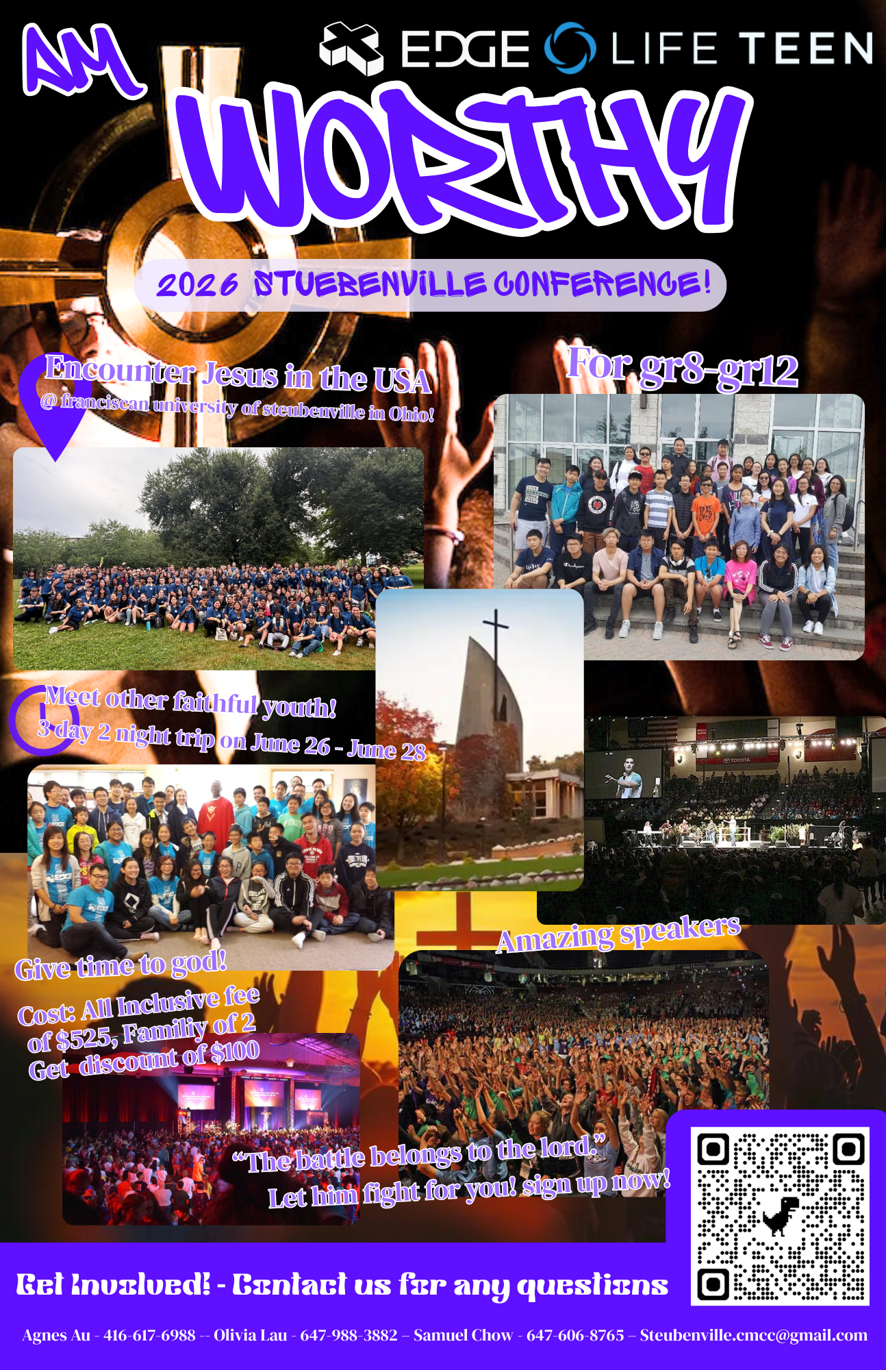 For enquiries or registration, please contact Agnes Au at 416-617-6988/ Olivia Lau 647-988-3882/ Samuel Chow 647-606-8765 or email Steubenville.cmcc@gmail.com.
